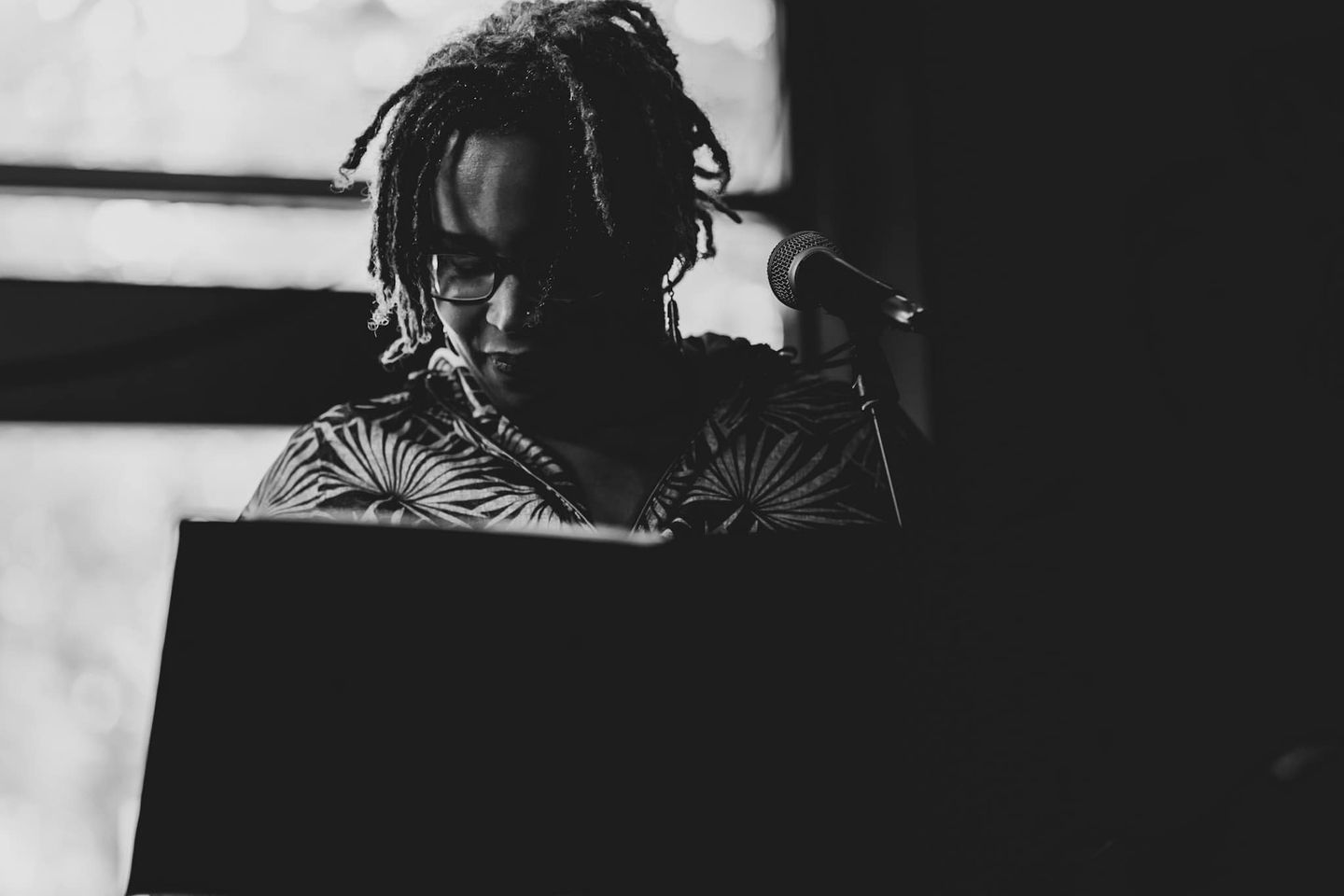 Pete Hyde of Pete Hyde & The Vieillards with white beard, wearing a black top and spectacles, singing into a microphone